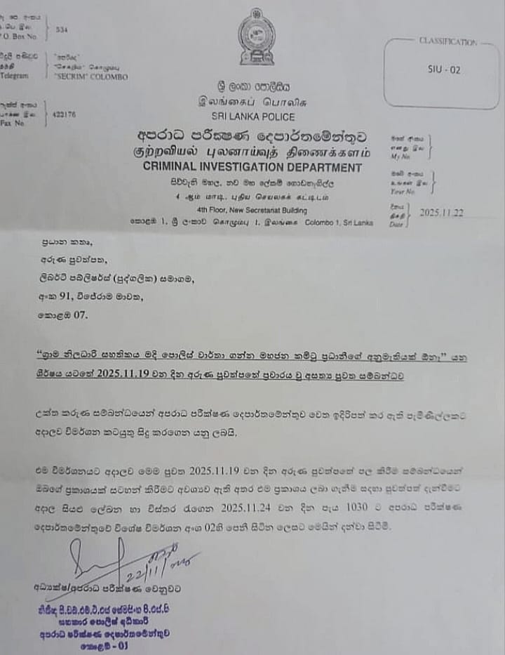 ඉහත ප්‍රවෘත්තිය සම්බන්ධ‍යෙන් ලද පැමිණිල්ලකට අදාළව කෙරෙන විමර්ශනය සඳහා පුවතට අදාළ සියලු ලේඛන සහිතව අපරාධ පරීක්ෂණ දෙපාර්තමේන්තුව හමුවේ පෙනී සිටින ලෙස දැනුම් දී ඇත්තේ අපරාධ පරීක්ෂණ දෙපාර්තමේන්තුවේ අධ්‍යක්ෂ වෙනුවට අත්සන් කොට ඇති එහි සහකාර පොලිස් අධිකාරීවරයා ය.