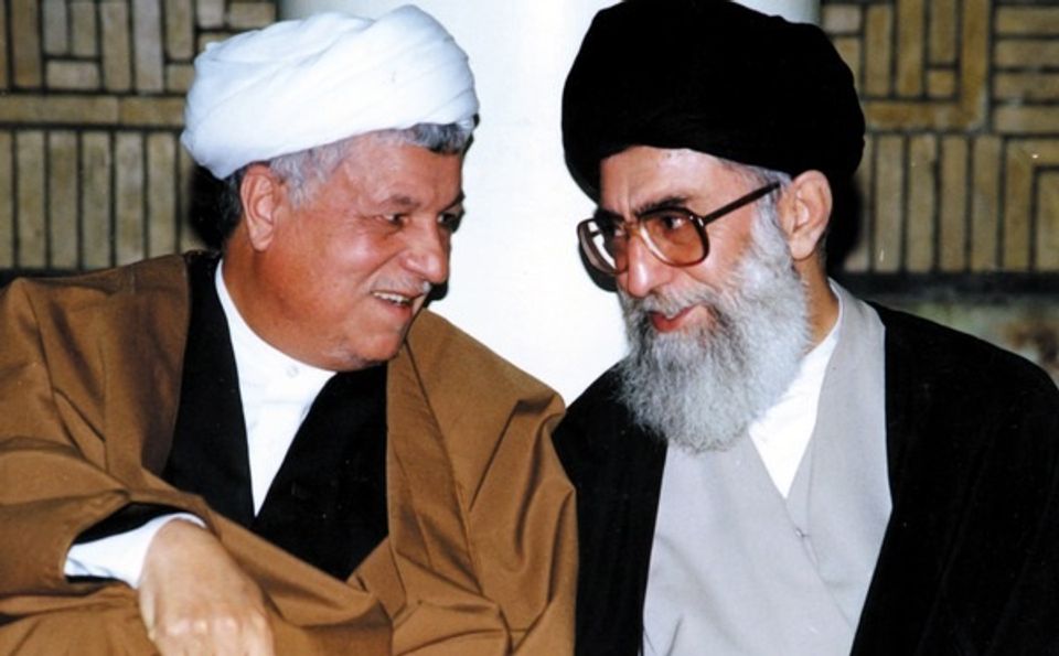 ඉරානයේ හිටපු ජනාධිපති හෂෙමි රෆ්සන්ජානි (වමේ) – ඉස්ලාමිය ජනරජයේ උත්තරීතර නායක අයතොල්ලා කමෙයිනි සමග ඡායාරූපයක. රෆ්සන්ජානි වොෂින්ටනය සමග යලි මිත‍්‍රවීම සඳහා දීර්ඝ කාලයක් පුරා තල්ලුව දුන්නේය. ඉරානයේ වත්මන් ජනපති හසන් රවුහානි ඔහුගේ අනුගාමිකයෙකි.